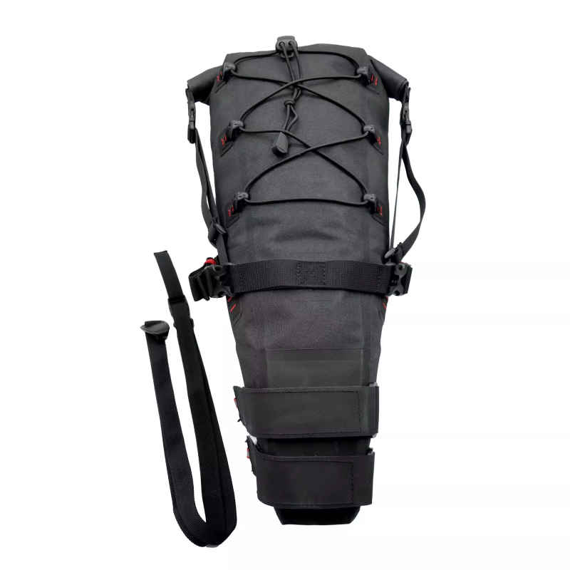 Nuevas bolsas de sillín Geosmina fabricadas enteramente en Nylon 600D e Hypalon y con las costuras selladas mediante Alta Frecuencia. Este Nylon es totalmente impermeable y lleva un tratamiento externo de PU (Poliuretano) que repele el agua y hace que la bolsa se seque rápidamente en contacto con el aire. La bolsa lleva una una película de TPU (Poliuretano Termoplástico) que junto con las costuras selladas, hacen que la bolsa sea totalmente estanca. Se fija a la bici mediante dos rediseñadas correas de Velcro. Dos tiras de Velcro reforzado con Hypalon y de gran sección se fijan a la tija de sillín y otras dos los rieles de este, también sobredimensionadas.