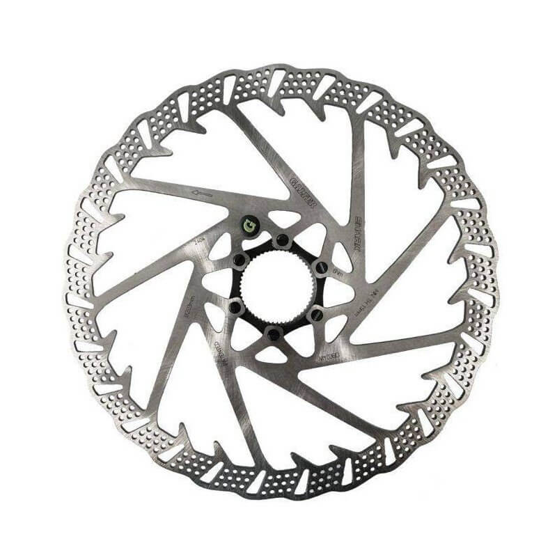 Con su innovador Shark Disc®, Galfer presenta un sofisticado disco de freno MTB para las disciplinas de mountain bike más exigentes. El innovador proceso de producción, mediante un cortador láser, consigue el diseño óptimo para el mejor rendimiento posible. Uno de los puntos de venta exclusivos más importantes son las aletas de tiburón internas (aletas de refrigeración), que dan nombre al disco: Shark Disc®. La interacción entre las aletas de tiburón y los numerosos orificios pequeños del disco reduce la acumulación de calor, mientras que el diseño ondulado exterior y las aberturas laterales permiten un rendimiento de frenado fuerte y uniforme.